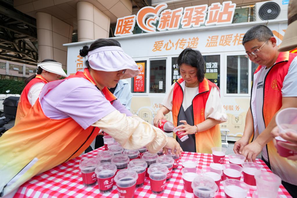 6月25日,在北京市東城區(qū)崇外街道一處“暖新驛站”外,街道工作人員在為高溫下的外賣員、快遞員準(zhǔn)備冰鎮(zhèn)飲料。新華社記者 鞠煥宗 攝