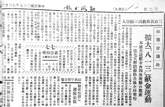 ????該報另一篇報道為《本城獻金臺?第五天獻金錄》。文中詳細記錄了獻金的地點、人物、獻金的數(shù)額:“革新路(十七日)臺山自衛(wèi)集訓大隊國幣七十二元六毫另廣東銅仙六枚、六歲小童饒棣棣毫券六毫……漢師奶毫券三十元、臺山造餅工會毫券十元、臺師附小省幣十元、譚達鋈紋銀戒指一枚……女師附?。ㄊ呷眨┡_城消防隊國幣五元、遠怡母省券一元、譚華盛紋銀頸鉗一只……”